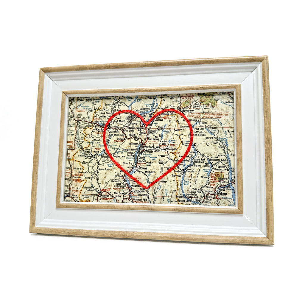 This vintage Vernon, British Columbia map print has been hand-embroidered with a red heart - symbolizing the places, people, and adventures you hold dear.