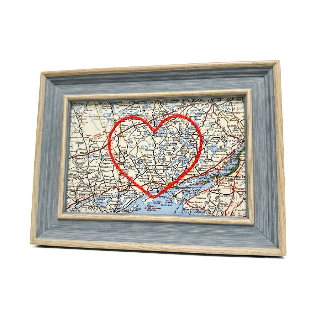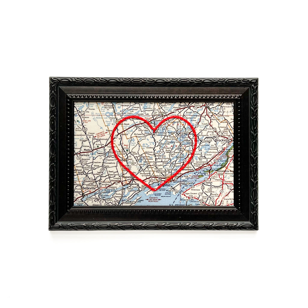 This vintage Verona, Ontario map print has been hand-embroidered with a red heart - symbolizing the places, people, and adventures you hold dear.