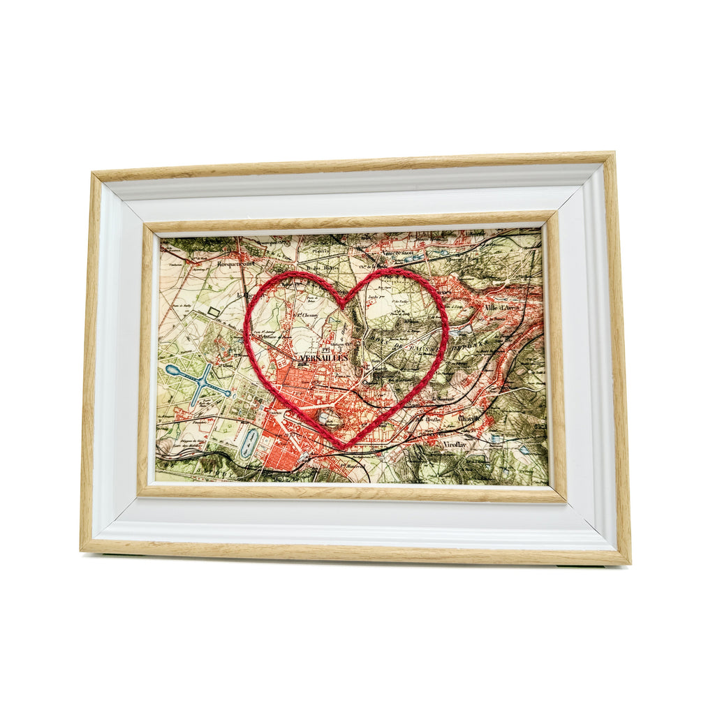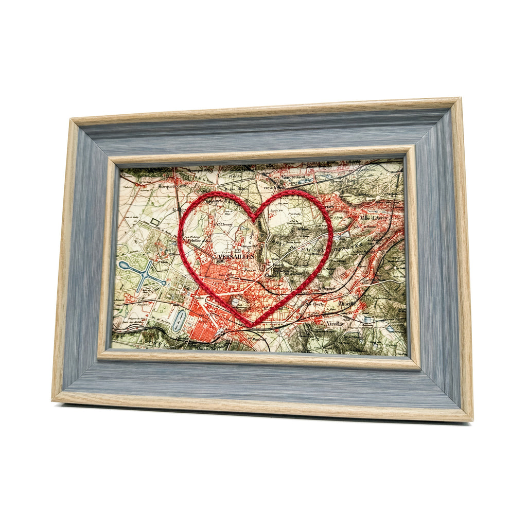 This vintage Versailles, France map print has been hand-embroidered with a red heart - symbolizing the places, people, and adventures you hold dear.