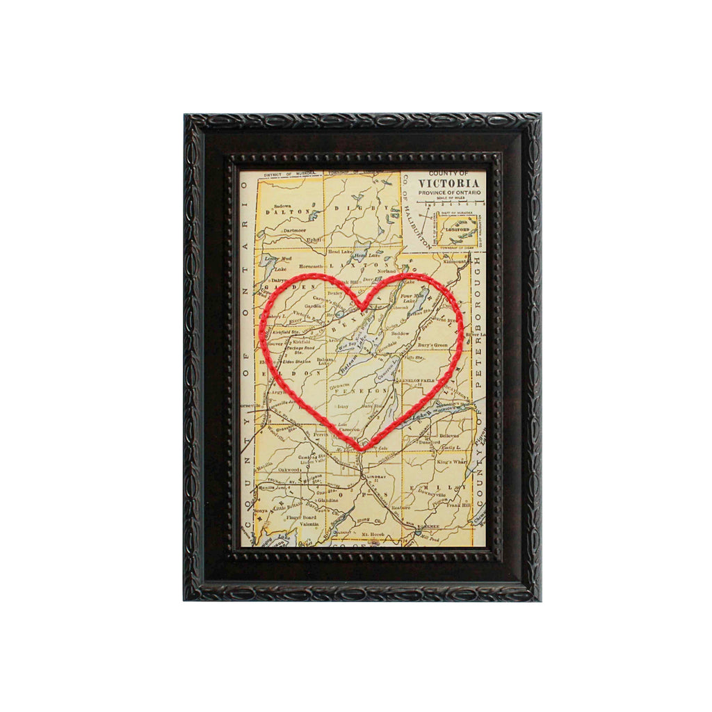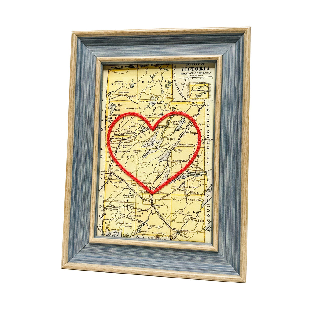 This vintage Victoria County, Ontario map print has been hand-embroidered with a red heart - symbolizing the places, people, and adventures you hold dear.