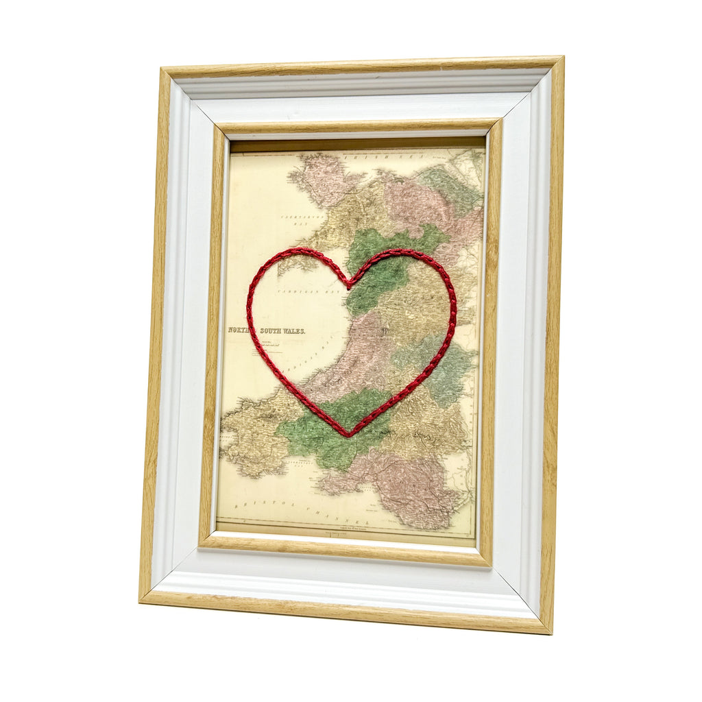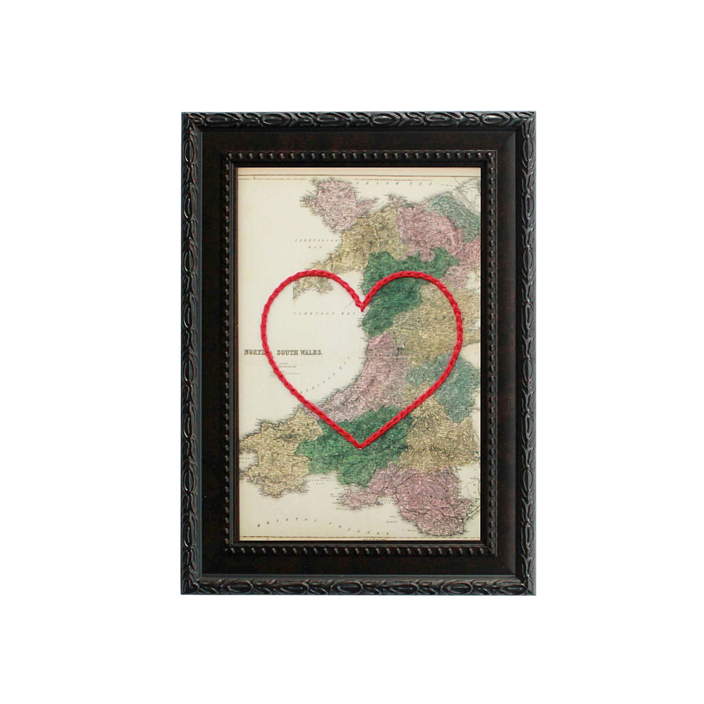 This vintage Wales map print has been hand-embroidered with a red heart - symbolizing the places, people, and adventures you hold dear.