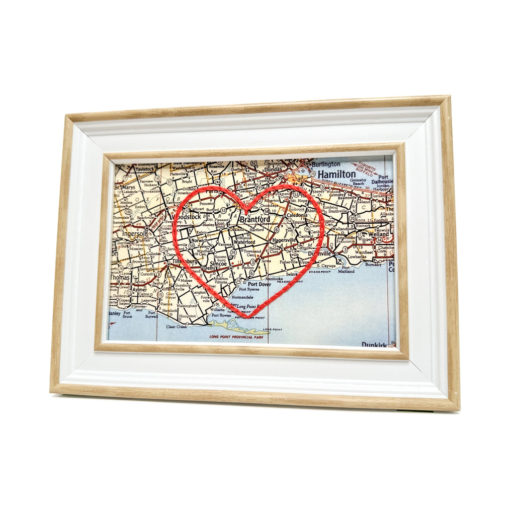 This vintage Waterford, Ontario map print has been hand-embroidered with a red heart - symbolizing the places, people, and adventures you hold dear.