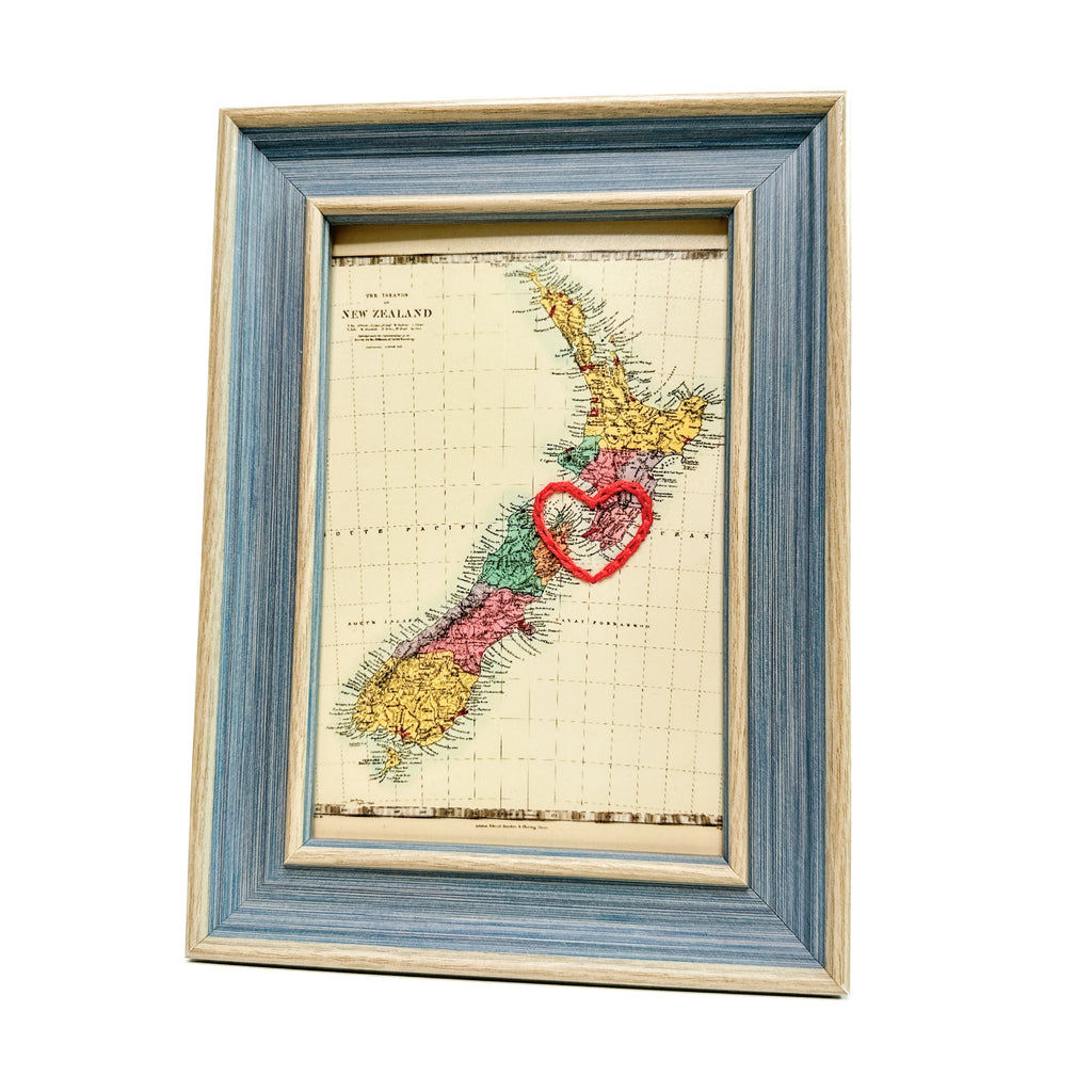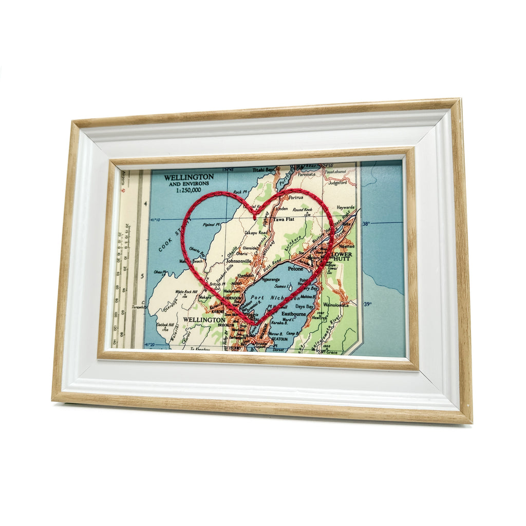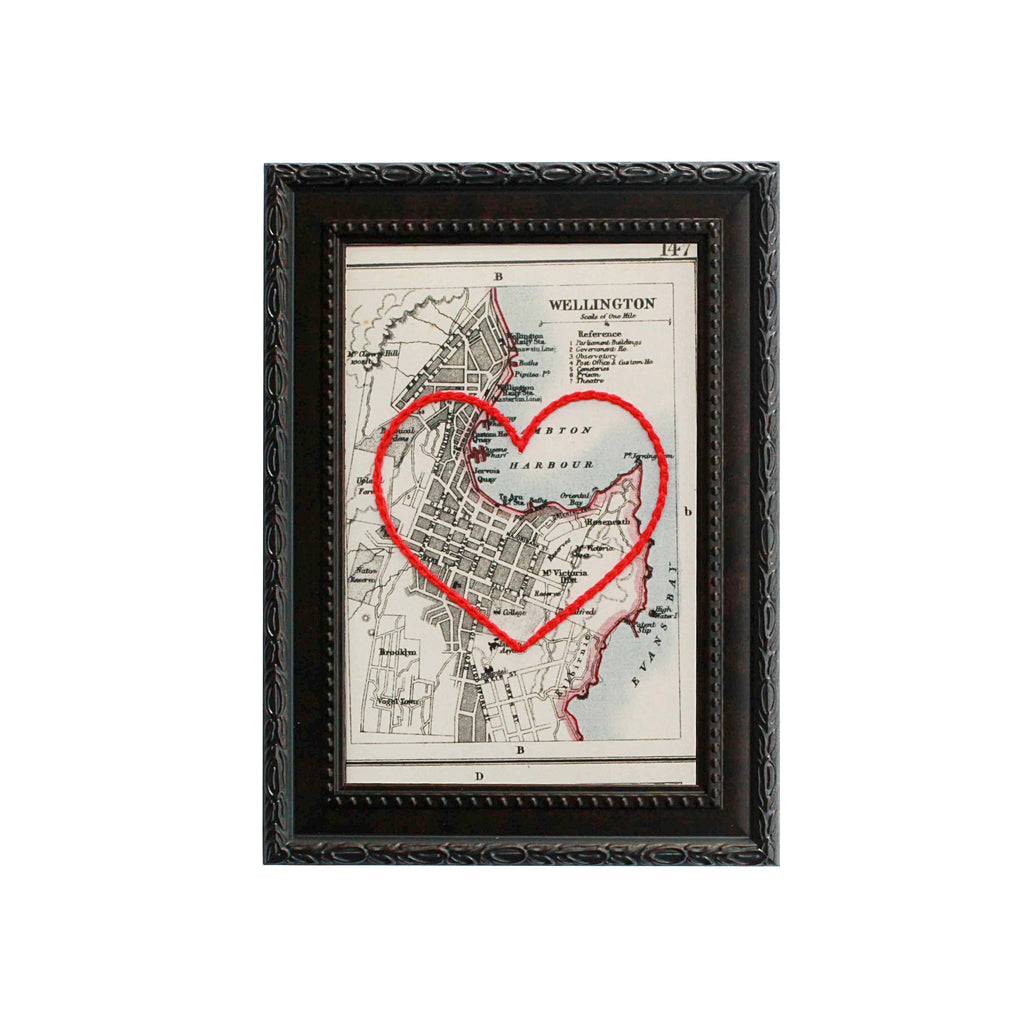 This vintage Wellington, New Zealand map print has been hand-embroidered with a red heart - symbolizing the places, people, and adventures you hold dear.