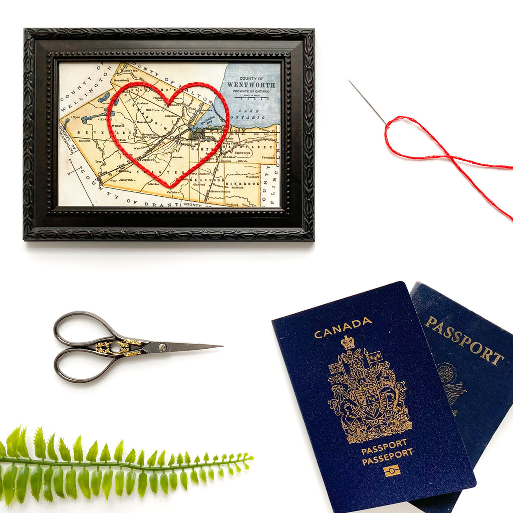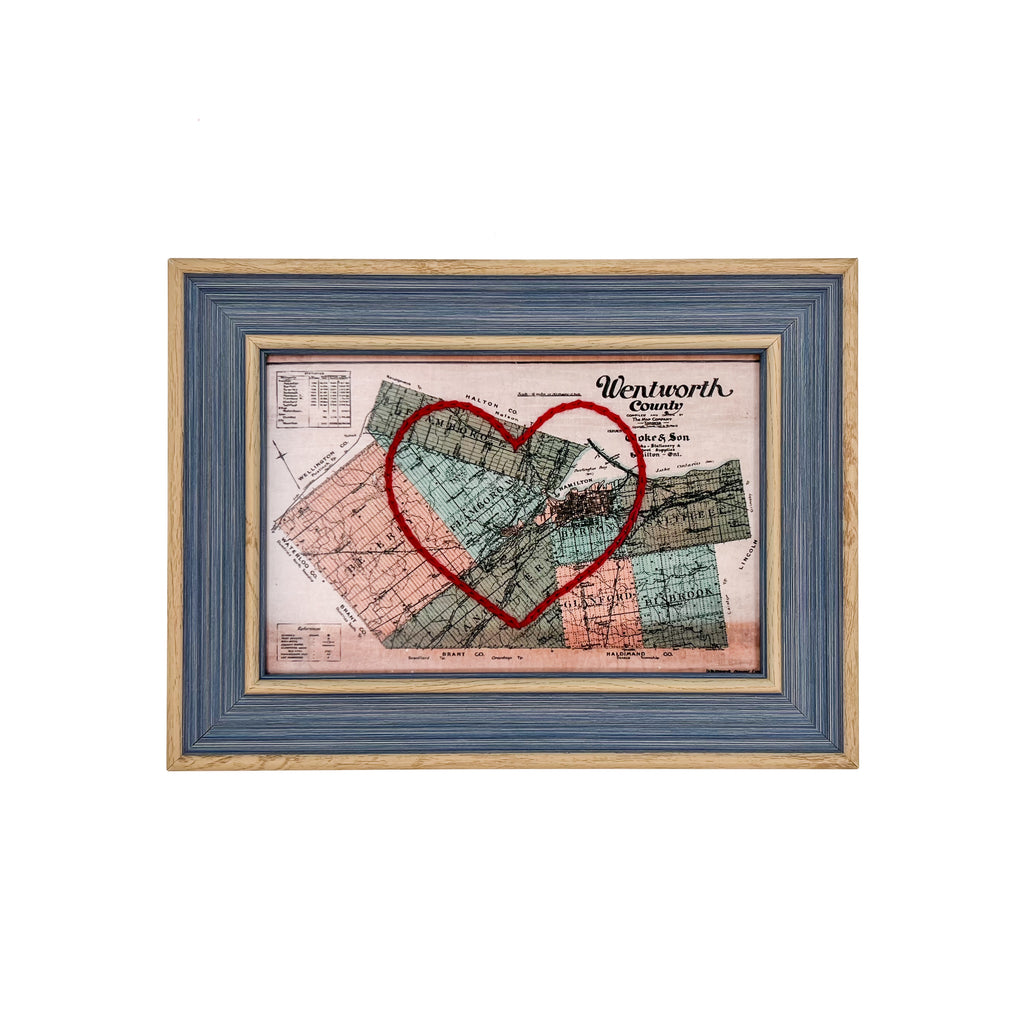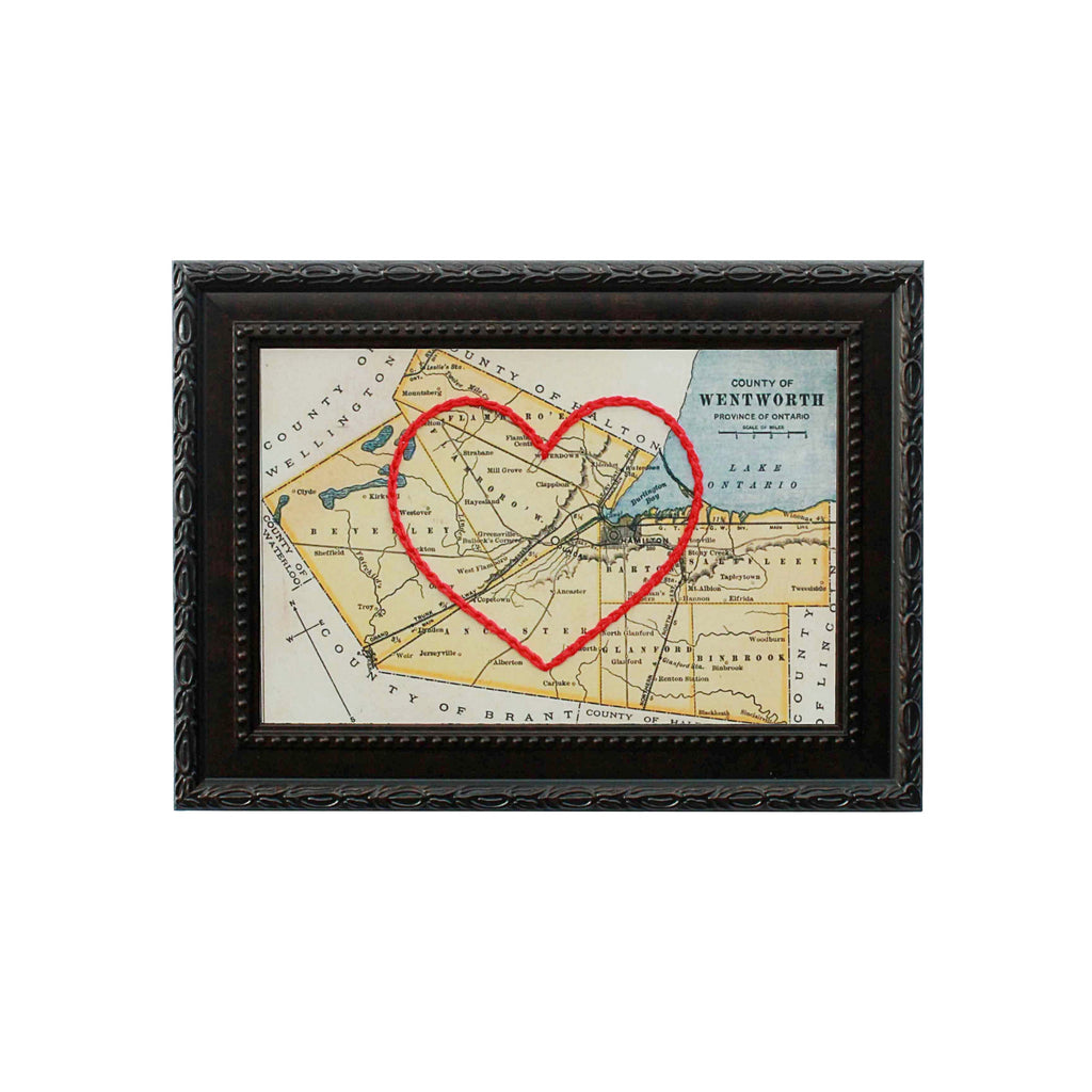 This vintage Wentworth County, Ontario map print has been hand-embroidered with a red heart - symbolizing the places, people, and adventures you hold dear.