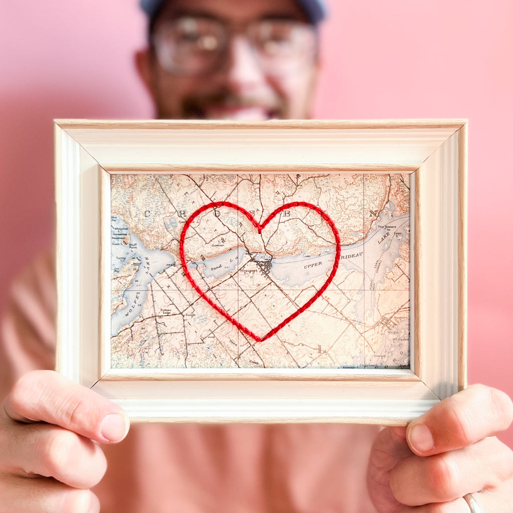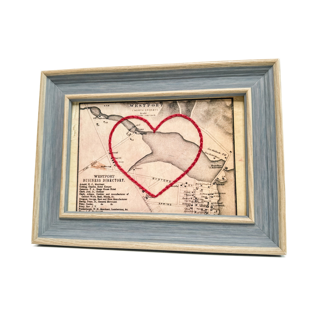 This vintage Westport, Ontario map print has been hand-embroidered with a red heart - symbolizing the places, people, and adventures you hold dear.