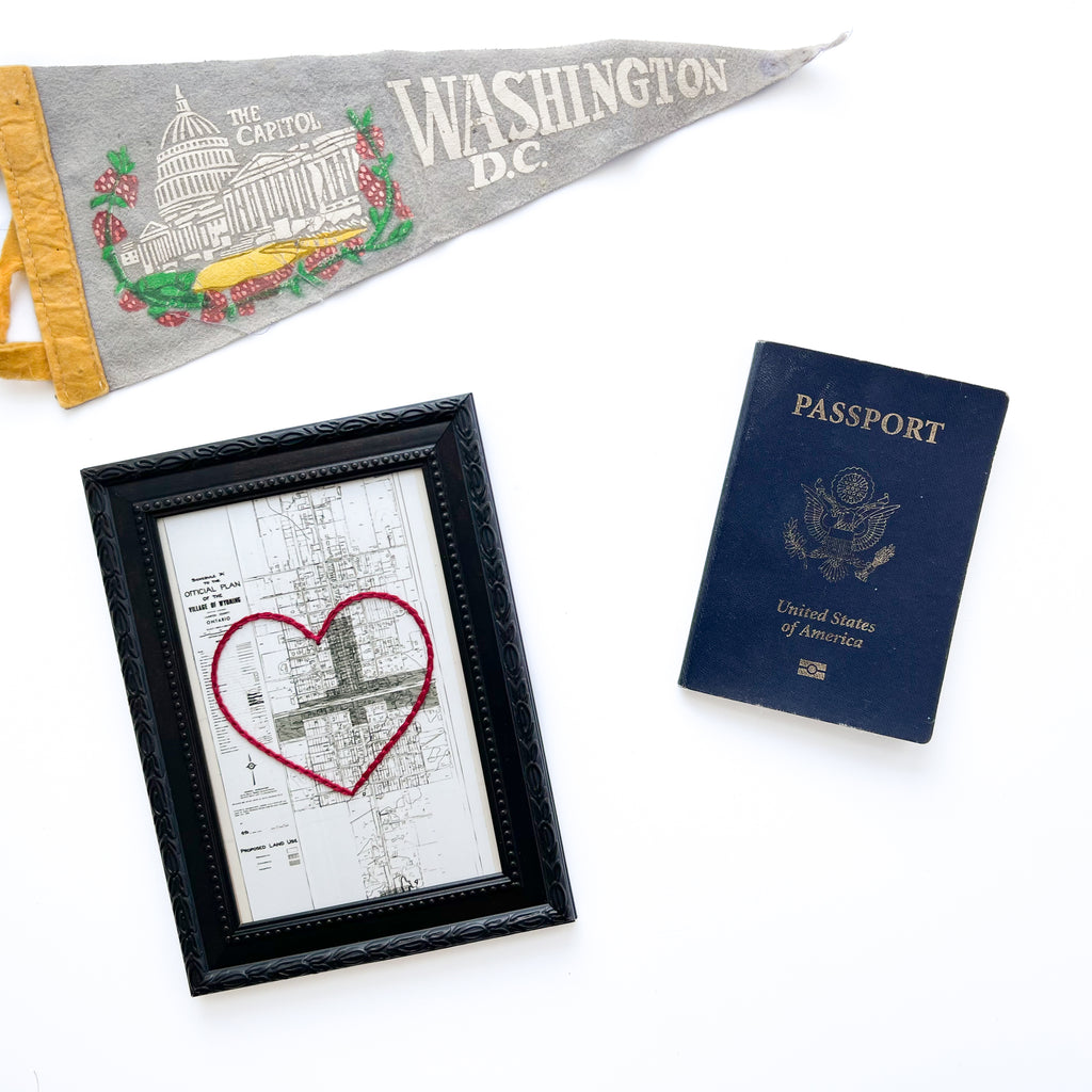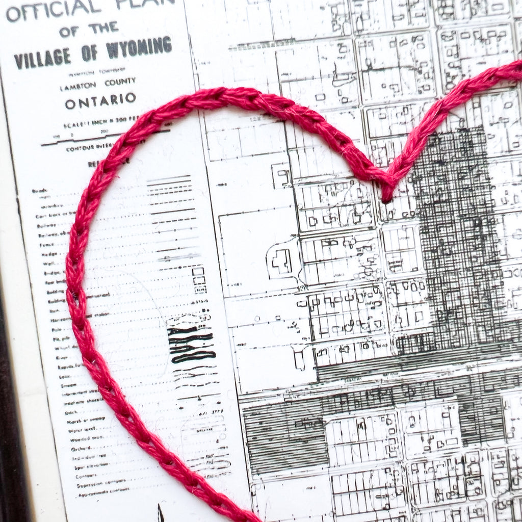 This vintage Wyoming, Ontario map print has been hand-embroidered with a red heart - symbolizing the places, people, and adventures you hold dear.